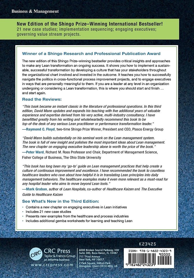 If you are a leader at any level in an organization undergoing or considering a Lean transformation, this is where you should start and finish ...and start again. Read the Reviews: "This book became an instant classic in the literature of professional operations. In this third edition, David Mann updates and expands his teaching with five additional years of valuable experience and expertise derived from his very active, multi-industry consultancy.