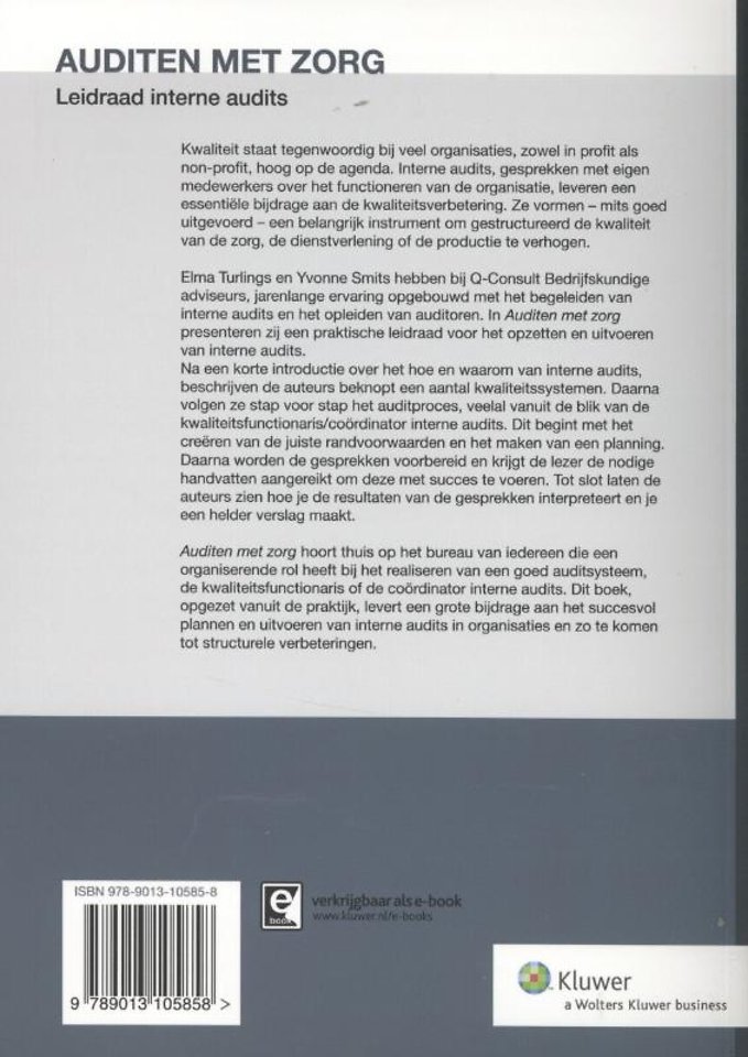 Elma Turlings en Yvonne Smits hebben bij Q-Consult Bedrijfskundige adviseurs jarenlange ervaring opgebouwd met het begeleiden van interne audits en het opleiden van auditoren. In Auditen met zorg presenteren zij een praktische leidraad voor het opzetten en uitvoeren