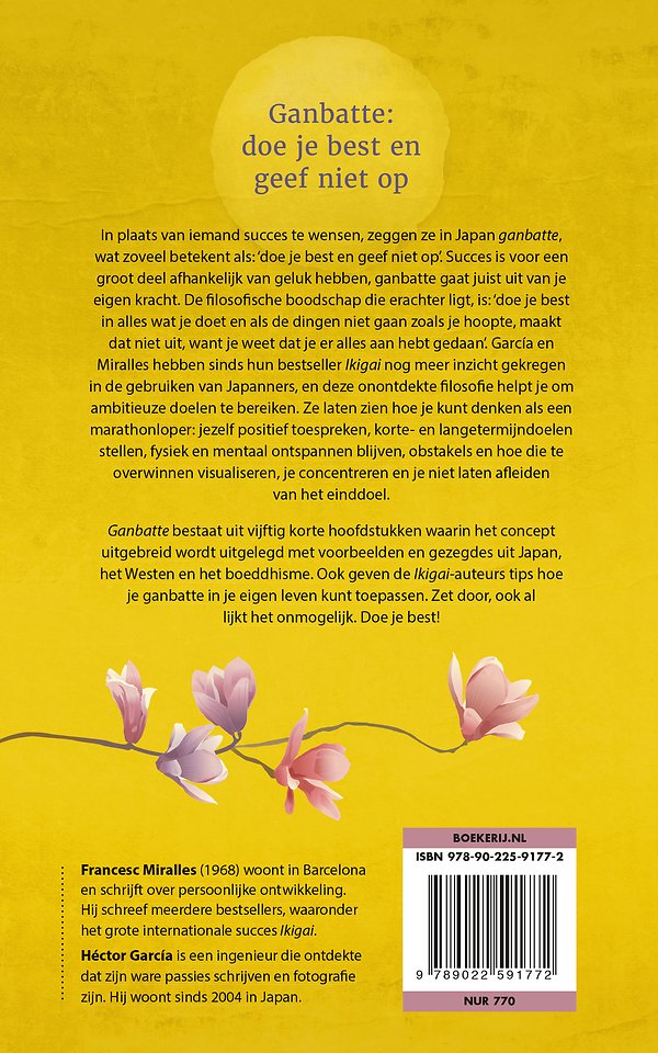 Ganbatte bestaat uit vijftig korte hoofdstukken waarin het concept uitgebreid wordt uitgelegd met voorbeelden en gezegdes uit Japan, het Westen en het boeddhisme. Ook geven de Ikigai-auteurs tips hoe je ganbatte in je eigen leven kunt toepassen. Zet door, ook al lijkt het onmogelijk. Doe je best!