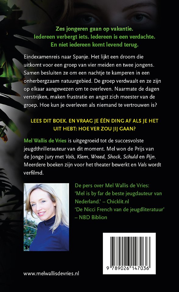 thriller overleving jeugdthriller spanning jongeren survival vermissing groepsdruk angst natuur frustratie kamperen spanje groepsdynamiek eindexamenreis isolatie adolescentie psychologie vriendschap wildernis morele dilemma's overleven verdwijning avontuur nachtmerries mysterie gevaar grenzen vertrouwen conflict