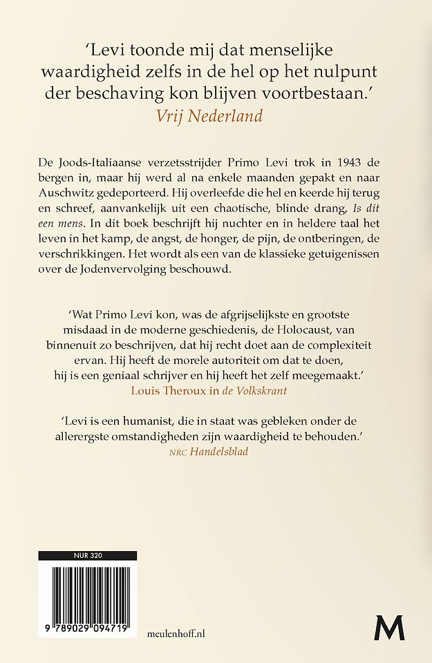 De Joods-Italiaanse verzetsstrijder Primo Levi trok in 1943 de bergen in, maar hij werd al na enkele maanden gepakt en naar Auschwitz gedeporteerd. Als een van de weinigen overleefde hij die hel en keerde hij terug en schreef, aanvankelijk uit een chaotische, blinde drang, Is dit een mens. In dit boek beschrijft hij in heldere taal en nuchter het leven in het kamp, de angst, de honger, de pijn, de ontberingen, de verschrikkingen. Het wordt terecht als een van de klassieke getuigenissen over de Jodenvervolging beschouwd.