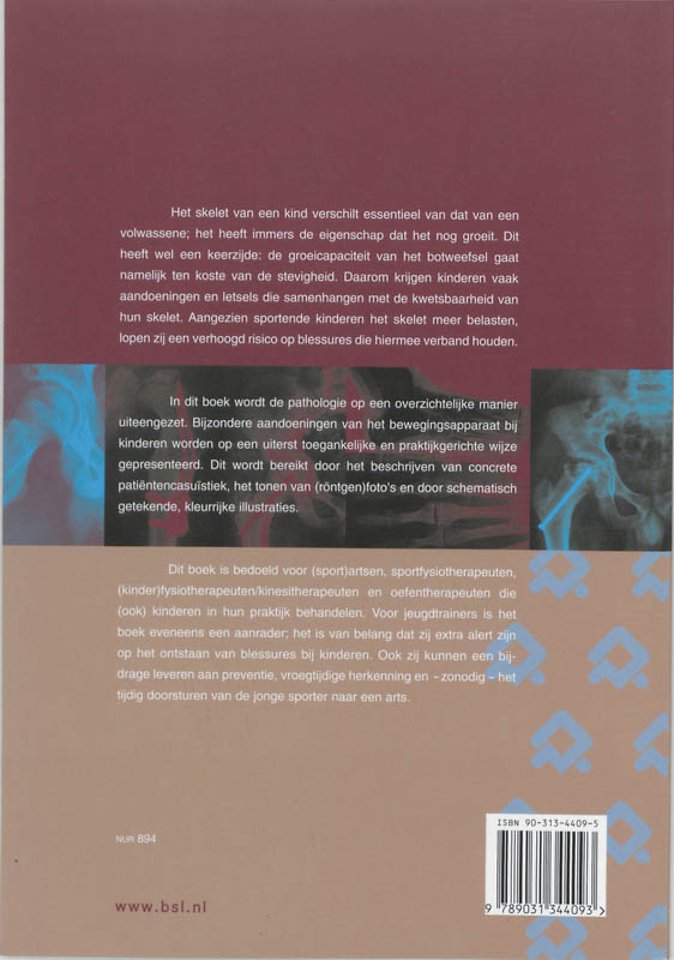 Het skelet van een kind verschilt essentieel van dat van een volwassene: het heeft de eigenschap dat het nog groeit. De skeletgroei heeft als keerzijde dat de groeicapaciteit van het botweefsel ten koste van de stevigheid gaat. Daardoor krijgen kinderen vaak aandoeningen en letsels die met de kwetsbaarheid van hun skelet samenhangen. Aangezien sportende kinderen hun skelet meer belasten, lopen zij een verhoogd risico op blessures die hiermee verband houden. In dit boek wordt de pathologie van het jeugdige skelet op een overzichtelijke manier uiteengezet. Bijzondere aandoeningen van het bewegingsapparaat bij kinderen worden op een uiterst toegankelijke en praktijkgerichte wijze gepresenteerd. Dit wordt bereikt door het beschrijven van concrete patiëntencasuïstiek, het tonen van (röntgen)foto's en schematisch getekende, kleurrijke illustraties.