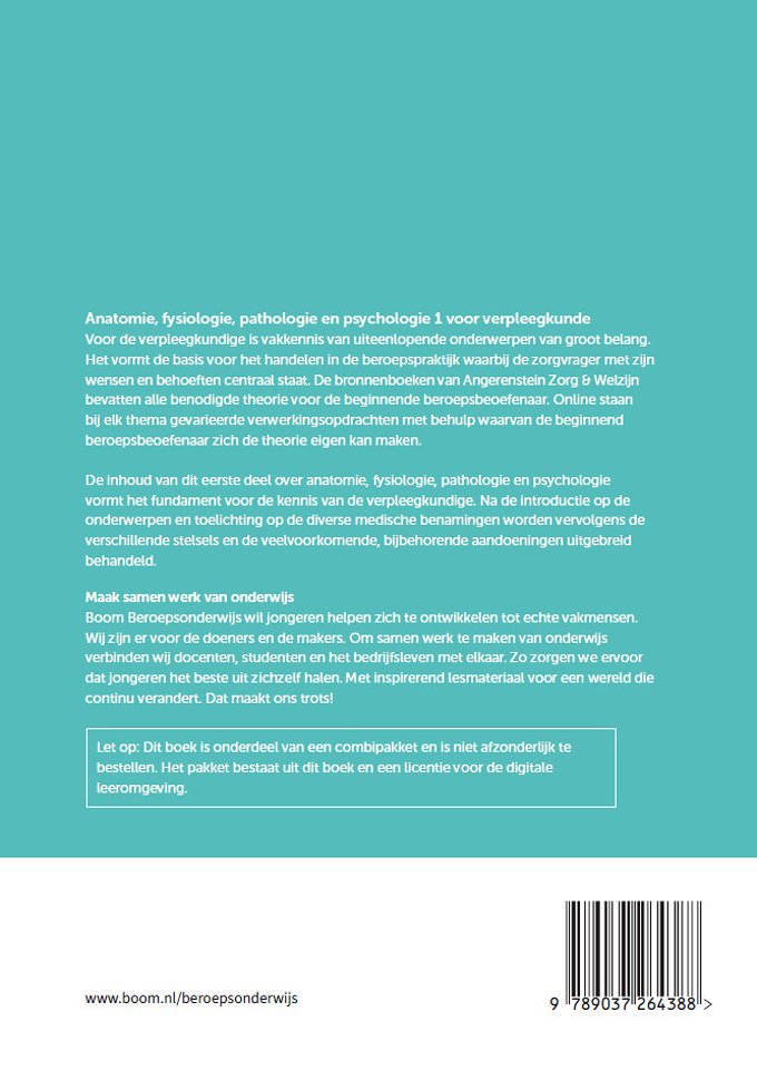 Dit betreft het eerste deel over anatomie, fysiologie, pathologie en psychologie voor verpleegkunde. Anatomie, fysiologie, pathologie en psychologie voor verpleegkunde 1 vormt het fundament voor de kennis van de verpleegkundige. Na de introductie op de onderwerpen en toelichting op de diverse medische benamingen worden vervolgens de verschillende stelsels uitgebreid behandeld met bijhorende aandoeningen.