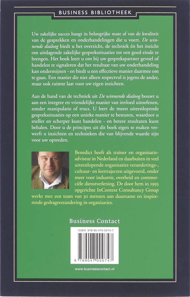 Meer over Thomas BenedictUw zakelijke succes hangt in belangrijke mate af van de kwaliteit van de gesprekken en onderhandelingen die u voert. 'De winnende dialoog' biedt u het overzicht, de techniek én het inzicht om uitdagende zakelijke gesprekssituaties tot een goed einde te brengen. Het boek leert u om bij uw gesprekspartner gevoel of handelen te signaleren dat het resultaat van uw onderhandeling kan ondermijnen - en biedt u een effectieve manier daarmee om te gaan. Een manier die niet alleen respectvol is jegens de ander, maar ook ruimte laat voor uw eigen inzichten.