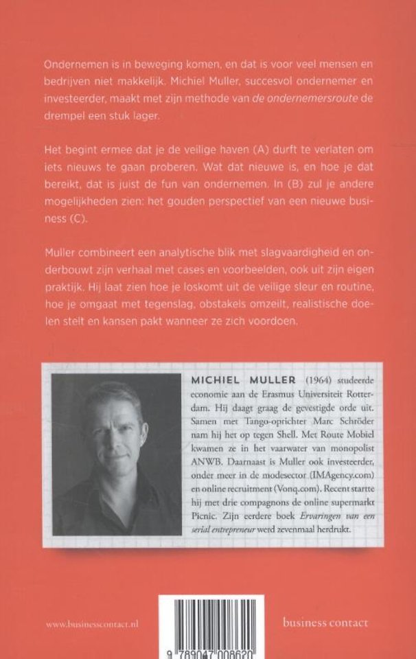 Meer over Michiel MullerOndernemen is in beweging komen, en dat is voor veel mensen en bedrijven niet makkelijk. Michiel Muller, succesvol ondernemer en investeerder, maakt met zijn methode van de ondernemersroute de drempel een stuk lager. Het begint ermee dat je de veilige haven (A) durft te verlaten om iets nieuws te gaan proberen. Wat dat nieuwe is, en hoe je dat bereikt, dat is juist de fun van ondernemen. In (B) zul je andere mogelijkheden zien: het gouden perspectief van een nieuwe business (C).