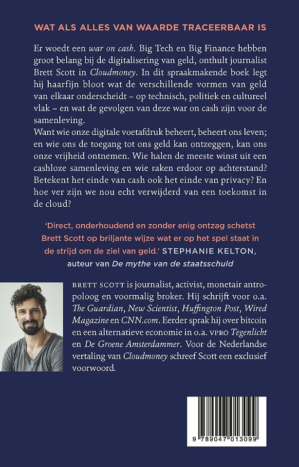 Big Tech en Big Finance hebben groot belang bij de digitalisering van geld, onthult journalist Brett Scott in 'Cloudmoney'. Er woedt een 'war on cash'. In dit spraakmakende boek legt Scott haarfijn bloot wat de verschillende vormen van geld van elkaar onderscheidt – op technisch, politiek en cultureel vlak – en wat de gevolgen van deze ‘war on cash’ zijn voor de samenleving.