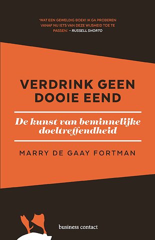 Meer over Marry de Gaay FortmanIn 'Verdrink geen dooie eend' vertelt topadvocaat Marry de Gaay Fortman over haar carrière als vrouw in een mannenwereld. De belangrijkste lessen: verspil geen energie aan negatieve situaties of dwarsliggers – ‘dooie eenden’ – en onderschat nooit de kracht van beminnelijkheid.