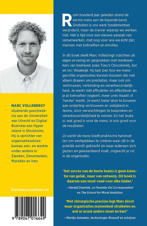 In dit boek deelt Marc Vollebregt inzichten uit eigen ervaring en gesprekken met medewerkers van bedrijven zoals Tony's Chocolonely, bol en RKC Waalwijk. Hij laat zien hoe we mensgerichte organisaties kunnen bouwen die niet alleen draaien om prestaties, maar ook om vertrouwen, verbinding en verantwoordelijkheid. Je werkt niet efficiënter en effectiever als je je behoeften negeert, meer uren maakt of harder werkt. Je werkt beter door te bouwen aan onderling vertrouwen en veiligheid in teams, door verwachtingen te bespreken en verantwoordelijkheid te nemen. En het leuke is: wat goed is voor de mens, is ook goed voor de resultaten.