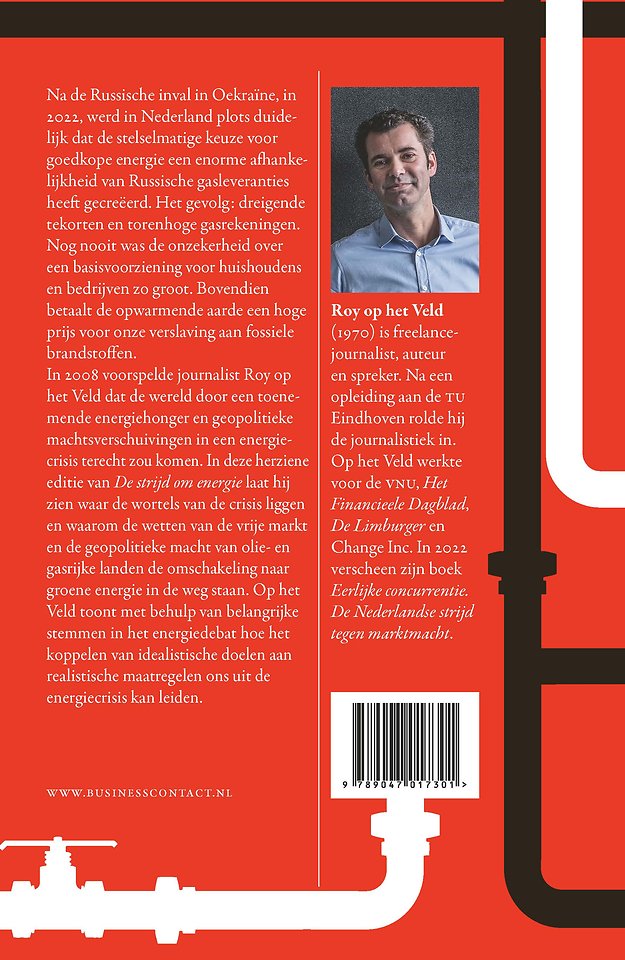 In 2008 voorspelde journalist Roy op het Veld dat de wereld door toenemende energiehonger en geopolitieke machtsverschuivingen in een energiecrisis terecht zou komen. In deze herziene editie van De strijd om energie laat hij zien waar de wortels van de crisis liggen en waarom de wetten van de vrije markt en de geopolitieke macht van olie- en gasrijke landen de omschakeling naar groene energie inde weg staan.