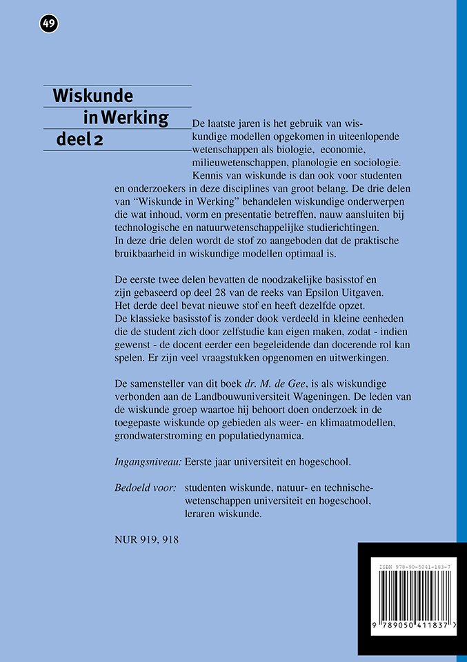 De laatste jaren is het gebruik van wiskundige modellen opgekomen in uiteenlopende wetenschappen als biologie, chemie, economie, farmacie, milieuwetenschappen, planologie en sociologie. Kennis van wiskunde is dan ook voor studenten en onderzoekers in deze disciplines van groot belang. De drie delen van Wiskunde in Werking behandelen wiskundige onderwerpen die, wat inhoud, vorm en presentatie betreffen, nauw aansluiten bij technologische en natuurwetenschappelijke studierichtingen. In deze drie delen wordt de stof zo aangeboden dat de praktische bruikbaarheid optimaal is.