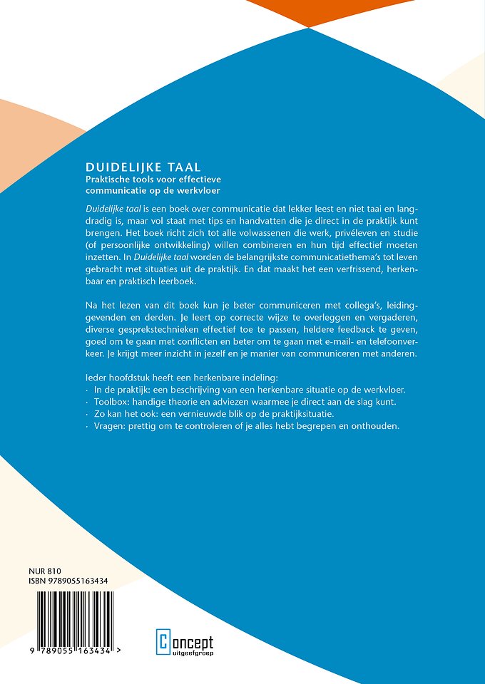 Duidelijke taal is een boek over communicatie dat lekker leest en niet taai en langdradig is, maar vol staat met tips en handvatten die je direct in de praktijk kunt brengen. Het boek richt zich tot alle volwassenen die werk, privéleven en studie (of persoonlijke ontwikkeling) willen combineren en hun tijd effectief moeten inzetten. In Duidelijke taal worden de belangrijkste communicatiethema’s tot leven gebracht met situaties uit de praktijk. En dat maakt het een verfrissend, herkenbaar en praktisch leerboek.