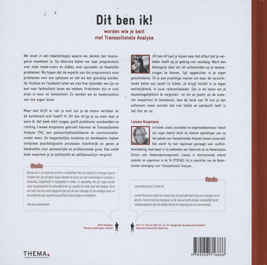 Maar wat blijft er van u over als u de mooie verhalen en de buitenkant eraf haalt? In 'Dit ben ik!' gaat u op zoek naar uw ware ik. Het boek stelt vragen, geeft praktische voorbeelden en richting. Lieuwe Koopmans gebruikt hiervoor de transactionele analyse, een persoonlijkheidstheorie en communicatiemodel ineen. De toegankelijke modellen en denkkaders maken complexe psychologische processen inzichtelijk en geven u handvatten voor persoonlijke en professionele groei. Een uniek boek waarmee u uw zelfinzicht en zelfbewustzijn vergroot.