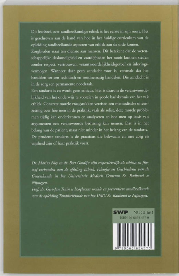 Dit leerboek over tandheelkundige ethiek is het eerste in zijn soort. Het is geschreven aan de hand van hoe in het huidige curriculum van de opleiding tandheelkunde in Nijmegen aspecten van ethiek aan de orde komen. Zorgbieden staat ten dienste aan mensen. Dit betekent dat de wetenschappelijke deskundigheid en vaardigheden het nooit kunnen stellen zonder respect, vertrouwen, verantwoordelijkheidsgevoel en inlevingsvermogen. Wanneer daar geen aandacht voor is, versmalt dat het handelen tot een technisch en routinematig handelen. Die aandacht is in de zorg een permanente noodzaak.