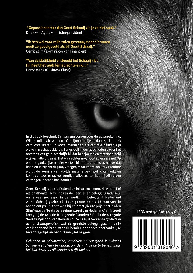 In dit boek beschrijft Schaaij zijn zorgen over de spaarrekening. Wil je miljonair worden of miljonair blijven dan is dit boek verplichte literatuur. Zowel overheden als centrale banken zijn wolven in schaapskleren. Langs de lijn der geschiedenis over het ontstaan van geld beschrijft hij dat het sjoemelen met spaargeld iets van alle tijden is.