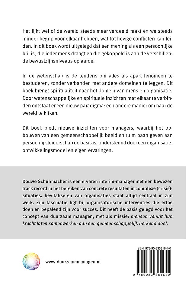 In de wetenschap is de tendens om alles als apart fenomeen te bestuderen, zonder verbanden met andere domeinen te leggen. Dit boek brengt spiritualiteit naar het domein van mens en organisatie. Door wetenschappelijke en spirituele inzichten met elkaar te verbinden ontstaat er een nieuw paradigma: een andere manier om naar de wereld te kijken.
