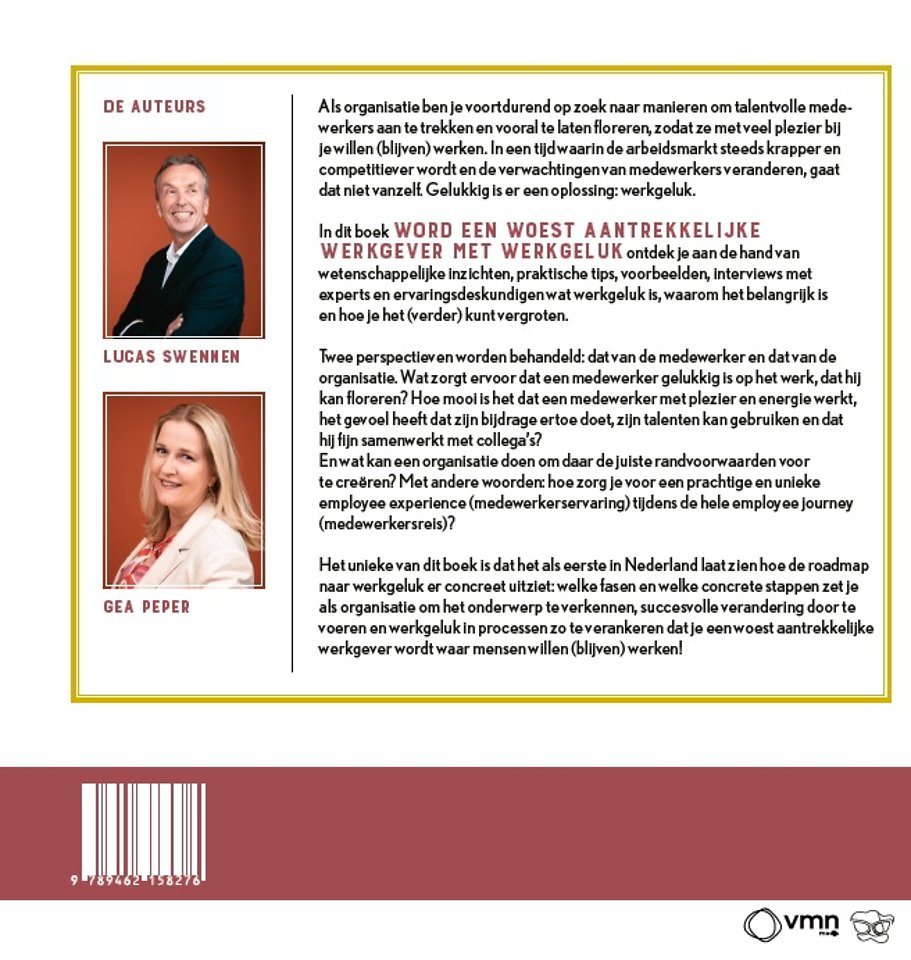 Het unieke van dit boek is dat het als eerste in Nederland laat zien hoe de roadmap naar werkgeluk er concreet uitziet: welke fasen en welke concrete stappen zet je als organisatie om het onderwerp te verkennen, succesvolle verandering door te voeren en werkgeluk in processen zo te verankeren dat je een woest aantrekkelijke werkgever wordt waar mensen willen (blijven) werken!