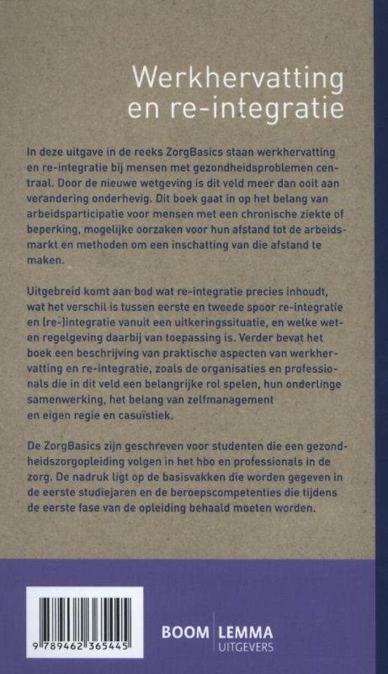 In deze uitgave in de reeks ZorgBasics staan werkhervatting en re-integratie bij mensen met gezondheidsproblemen centraal. Door de nieuwe wetgeving is dit veld meer dan ooit aan verandering onderhevig. Dit boek gaat in op het belang van arbeidsparticipatie voor mensen met een chronische ziekte of beperking, mogelijke oorzaken voor hun afstand tot de arbeidsmarkt en methoden om een inschatting van die afstand te maken.