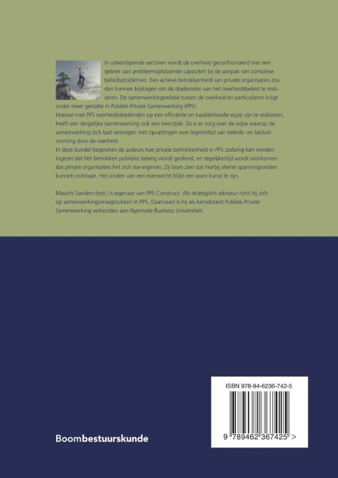 In deze bundel bespreken de auteurs hoe private betrokkenheid in PPS zodanig kan worden ingezet dat het betrokken publieke belang wordt gediend, en tegelijkertijd wordt voorkomen dat private organisaties het zich toe-eigenen. Zij laten zien dat hierbij allerlei spanningsvelden kunnen ontstaan. Het vinden van een evenwicht blijkt een ware kunst te zijn.
