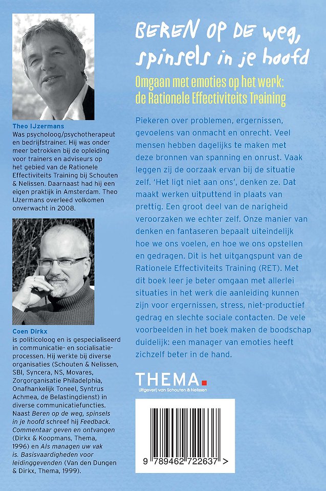 Onze manier van denken en fantaseren bepaalt uiteindelijk hoe we ons voelen en hoe we ons opstellen en gedragen. Dit is het uitgangspunt van de Rationele Effectiviteits Training (RET) Met dit boek leer je beter omgaan met allerlei situaties in het werk die aanleiding kunnen zijn voor ergernissen, stress, niet-productief gedrag en slechte sociale contacten. De vele voorbeelden in het boek maken de boodschap duidelijk: een manager van emoties heeft zichzelf beter in de hand.