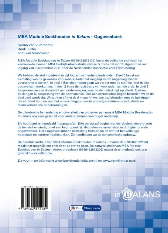MBA Module Boekhouden in Balans (9789462872172) bevat de volledige stof voor het vernieuwde examen MBA Bedrijfsadministratie niveau 5, zoals dat wordt afgenomen met ingang van 1 september 2017 door de Nederlandse Associatie voor Examinering.