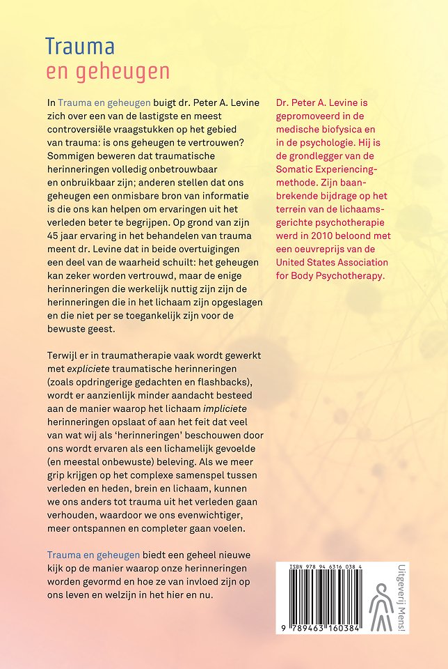 In 'Trauma en geheugen' buigt dr. Peter A. Levine zich over een van de lastigste en meest controversiële vraagstukken op het gebied van trauma: is ons geheugen te vertrouwen? Sommigen beweren dat traumatische herinneringen volledig onbetrouwbaar en onbruikbaar zijn; anderen stellen dat ons geheugen een onmisbare bron van informatie is die ons kan helpen om ervaringen uit het verleden beter te begrijpen. Op grond van zijn 45 jaar ervaring in het behandelen van trauma meent dr. Levine dat in beide overtuigingen een deel van de waarheid schuilt: het geheugen kan zeker worden vertrouwd, maar de enige herinneringen die werkelijk nuttig zijn zijn de herinneringen die in het lichaam zijn opgeslagen en die niet per se toegankelijk zijn voor de bewuste geest.