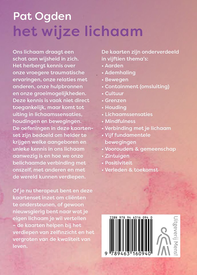 Ons lichaam draagt een schat aan wijsheid in zich. Het herbergt kennis over onze vroegere traumatische ervaringen, onze relaties met anderen, onze hulpbronnen en onze groeimogelijkheden. Deze kennis is vaak niet direct toegankelijk, maar komt tot uiting in lichaamssensaties, houdingen en bewegingen. De oefeningen in deze kaartenset zijn bedoeld om helder te krijgen welke aangeboren en unieke kennis in ons lichaam aanwezig is en hoe we onze belichaamde verbinding met onszelf, met anderen en met de wereld kunnen verdiepen.