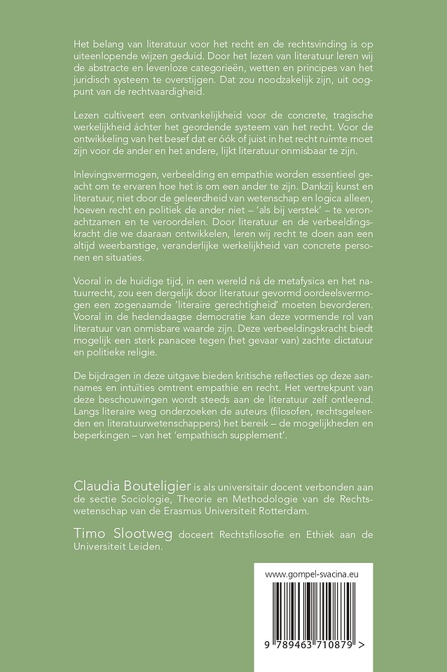 De bijdragen in deze uitgave bieden kritische reflecties op deze aannames en intuïties omtrent empathie en recht. Het vertrekpunt van deze beschouwingen wordt steeds aan de literatuur zelf ontleend. Langs literaire weg onderzoeken de auteurs (filosofen, rechtsgeleerden en literatuurwetenschappers) het bereik – de mogelijkheden en beperkingen – van het ‘empathisch supplement’.