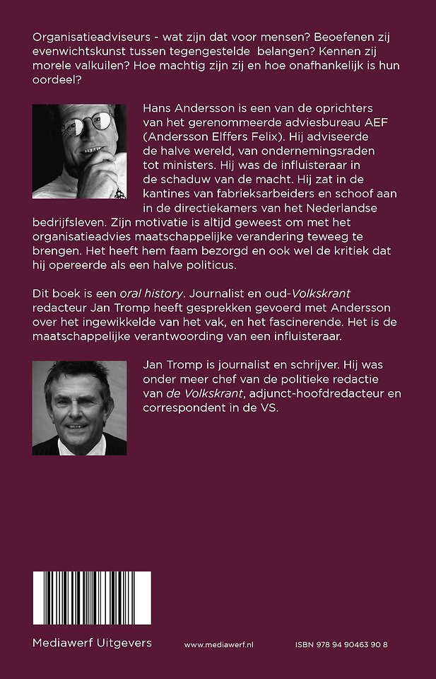 Hans Andersson is een van de oprichters van het gerenommeerde adviesbureau AEF (Andersson Elffers Felix). Hij adviseerde de halve wereld, van ondernemingsraden tot ministers. Hij was de influisteraar in de schaduw van de macht. Hij nam plaats aan de ronde tafels van bestuurscolleges, hij zat in de kantines van fabrieksarbeiders en schoof aan in de directiekamers van het Nederlandse bedrijfsleven. In de salons van de politieke macht nestelde hij zich in de canapés. Zijn motivatie is altijd geweest om met het organisatieadvies als vehikel maatschappelijke verandering teweeg te brengen. Het heeft hem faam bezorgd en ook wel de kritiek dat hij opereerde als een halve politicus.