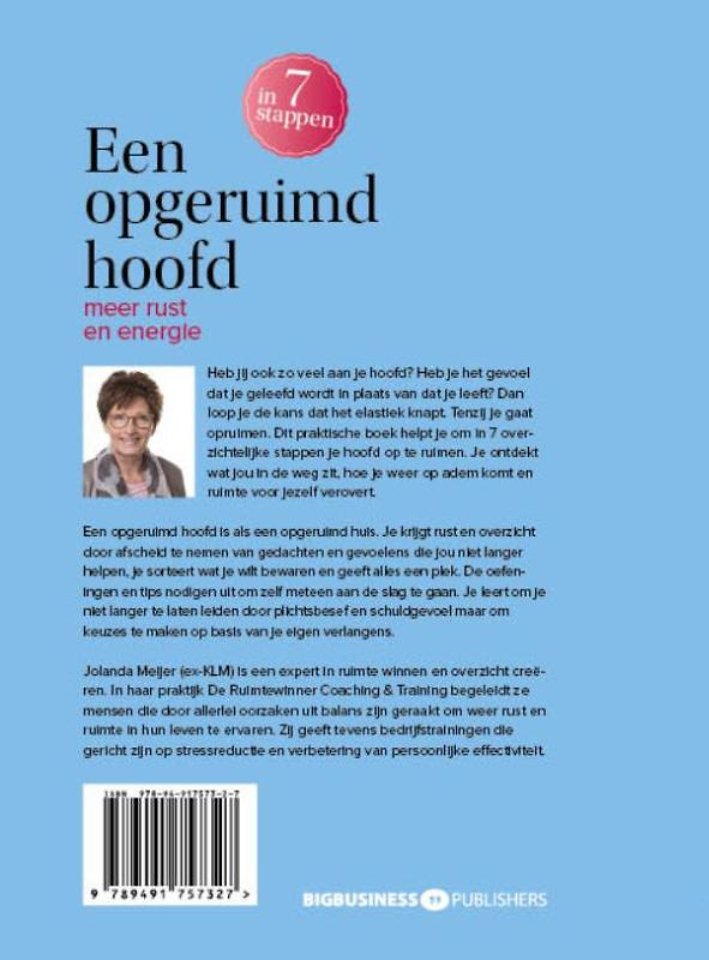 Meer over Jolanda MeijerHeb jij ook zo veel aan je hoofd? Heb je het gevoel dat je geleefd wordt in plaats van dat je leeft? Dan loop je de kans dat het elastiek knapt. Tenzij je gaat opruimen. Dit praktische boek helpt je om in 7 overzichtelijke stappen je hoofd op te ruimen. Je ontdekt wat jou in de weg zit, hoe je weer op adem komt en ruimte voor jezelf verovert.
