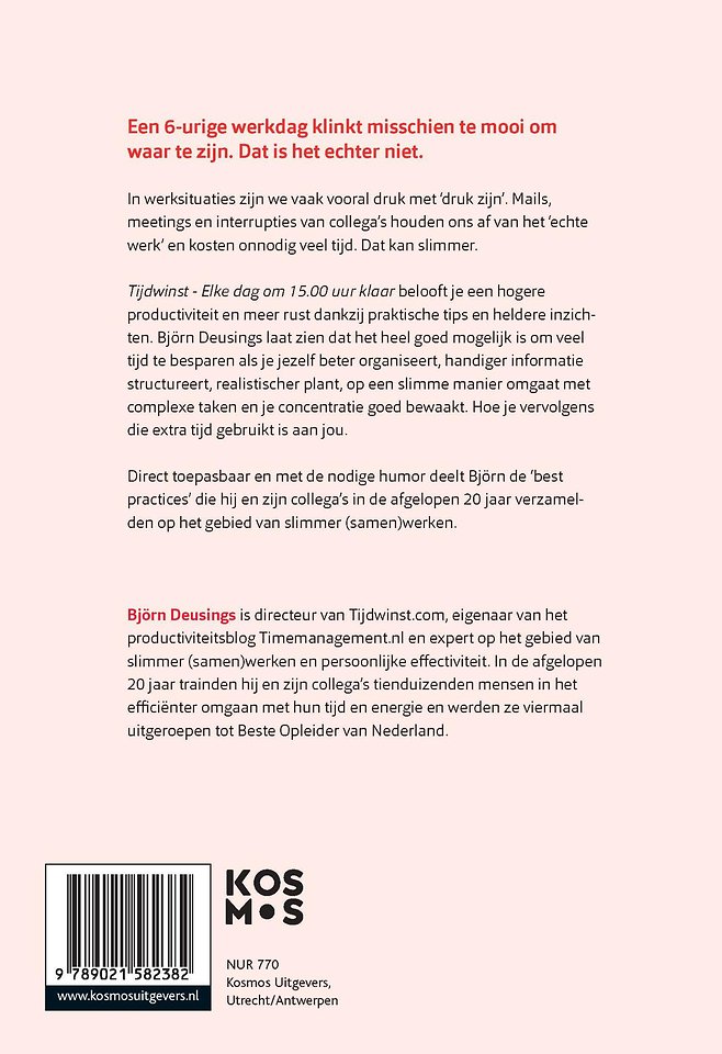 Meer over Björn DeusingsGrote kans dat jij of je vrienden je er regelmatig schuldig aan maken. Op de vraag hoe het gaat, krijg je vaak het antwoord: 'Goed, druk!'. Maar mensen zijn vaak vooral 'druk met druk zijn'. Mails, meetings en doorlopende interrupties houden ons af van het 'echte werk' en kosten onnodig veel tijd. Dat kan slimmer. Het boek Tijdwinst – Elke dag om 15.00 uur klaar belooft je een hogere productiviteit en meer rust dankzij praktische tips.