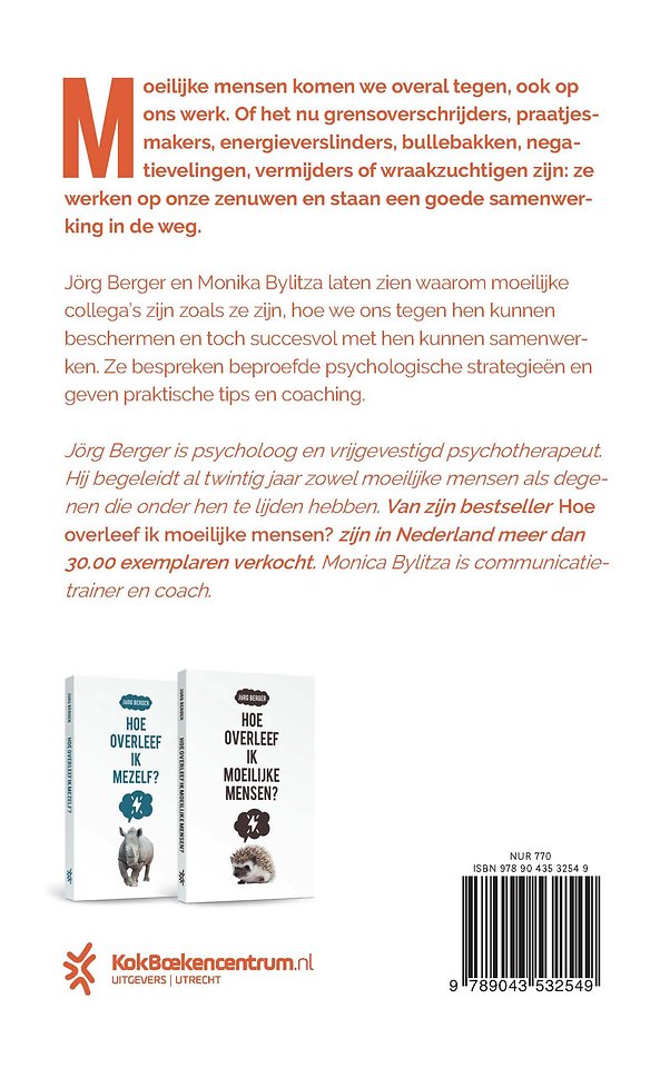 Meer over de auteursIn Hoe overleef ik moelijke collega’s bespreken Jörg Berger en Monika psychologische strategieën voor de omgang met moeilijke collega’s. Moeilijke mensen komen we overal tegen, ook op ons werk.