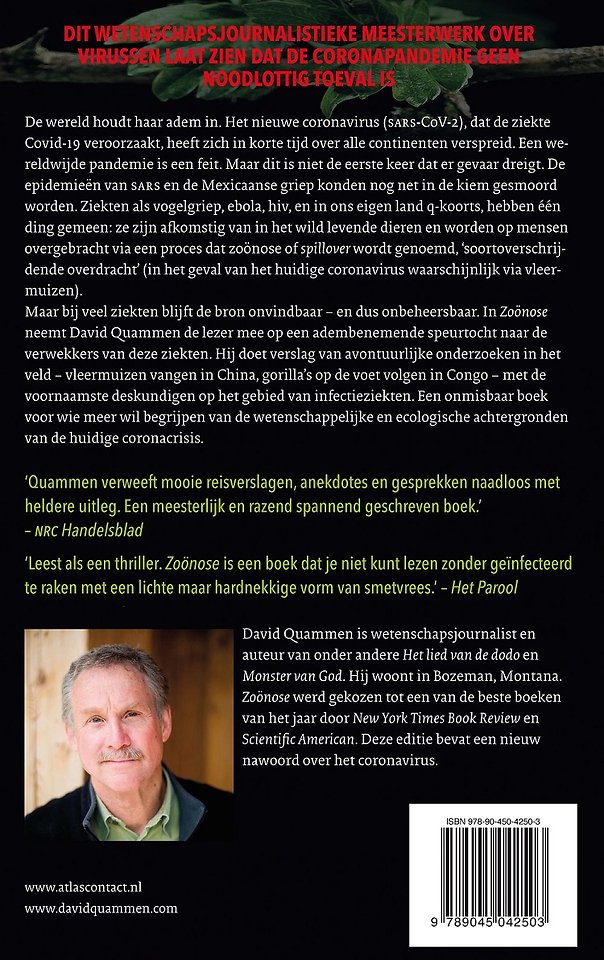 Maar bij veel ziekten blijft de bron onvindbaar – en dus onbeheersbaar. In 'Zoönose' neemt David Quammen de lezer mee op een adembenemen-de speurtocht naar de verwekkers van deze ziekten. Hij doet verslag van avontuurlijke onderzoeken in het veld – vleermuizen vangen in China, gorilla’s op de voet volgen in Congo – met de voornaamste deskundigen op het gebied van infectieziekten. Dit boek is onmisbaar voor wie meer wil snappen over de wetenschappelijke en ecologische achtergronden van de huidige coronacrisis.