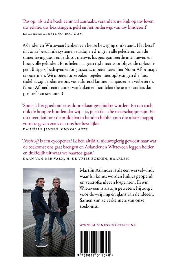 Burgers, bedrijven en organisaties moeten leren het Nooit Af-principe te omarmen. We moeten onze zaken regelen met oplossingen die juist tijdelijk zijn, zodat we ons voortdurend kunnen aanpassen en verbeteren. Dit vereist een totaal nieuwe kijk op de fundamenten van ons leven: werk, school, wonen, relaties, overheidstaken, management en wetgeving. Nooit Af zet de eerste stap.
