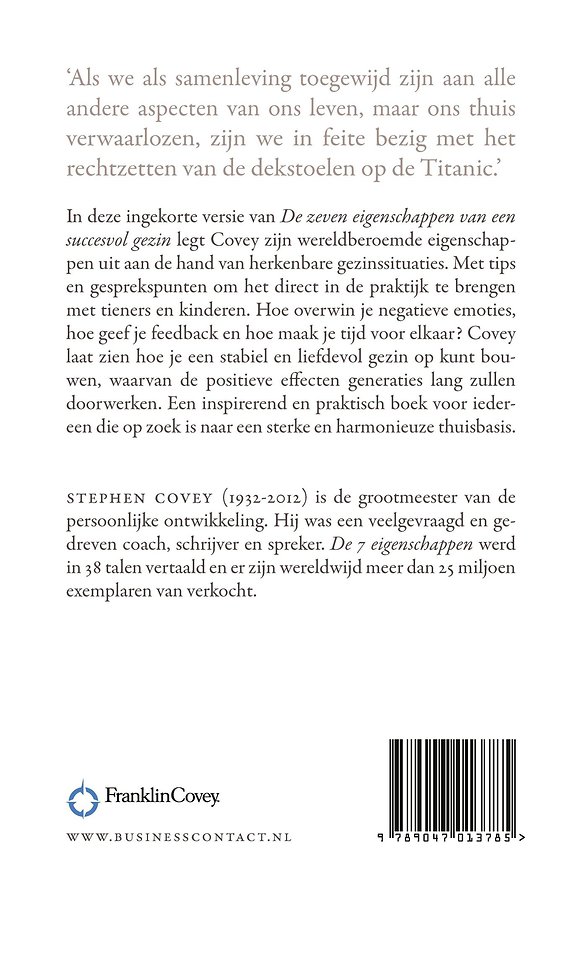 Covey laat in ‘De zeven eigenschappen van een succesvol gezin’ zien hoe je een stabiel en liefdevol gezin op kunt bouwen, waarvan de positieve effecten generaties lang zullen doorwerken. Een inspirerend en praktisch boek voor iedereen die op zoek is naar een sterke en harmonieuze thuisbasis.