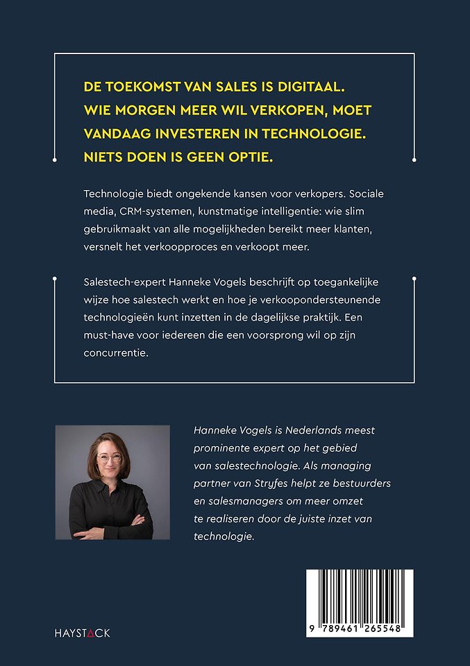 Meer over Hanneke VogelsDe toekomst van sales is digitaal. Wie morgen meer wil verkopen, moet vandaag investeren in technologie. Niets doen is geen optie. Technologie biedt ongekende kansen voor verkopers. Sociale media, CRM-systemen, kunstmatige intelligentie: wie slim gebruikmaakt van alle mogelijkheden bereikt meer klanten, versnelt het verkoopproces en verkoopt meer.