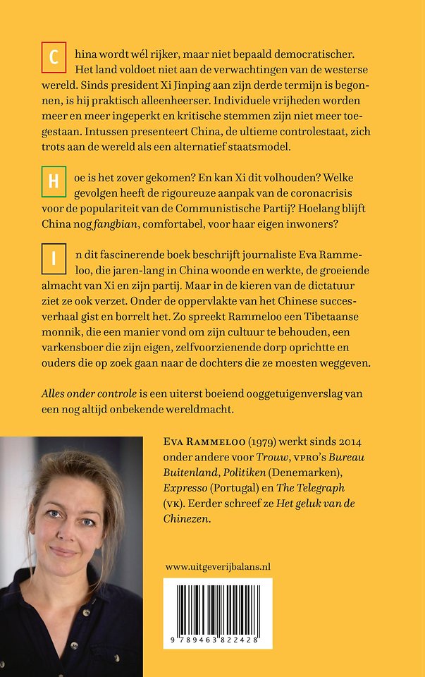Eva Rammeloo woont en werkt al jaren in China. In het fascinerende Alles onder controle beschrijft ze de groeiende almacht van Xi en zijn partij, maar in de kieren van de dictatuur ziet ze ook verzet. Onder de oppervlakte van het Chinese succesverhaal gist en borrelt het. Zo spreekt Rammeloo een Tibetaanse monnik, die een manier vond om zijn cultuur te behouden. Een varkensboer die zijn eigen, zelfvoorzienende dorp oprichtte. Ouders die zich er niet bij neerleggen dat hun dochter is weggegeven. Studenten in Hongkong die tot het uiterste gaan voor hun vrijheid. Alles onder controle is een uiterst boeiend ooggetuigenverslag uit de haarvaten van een nog altijd onbekende wereldmacht.