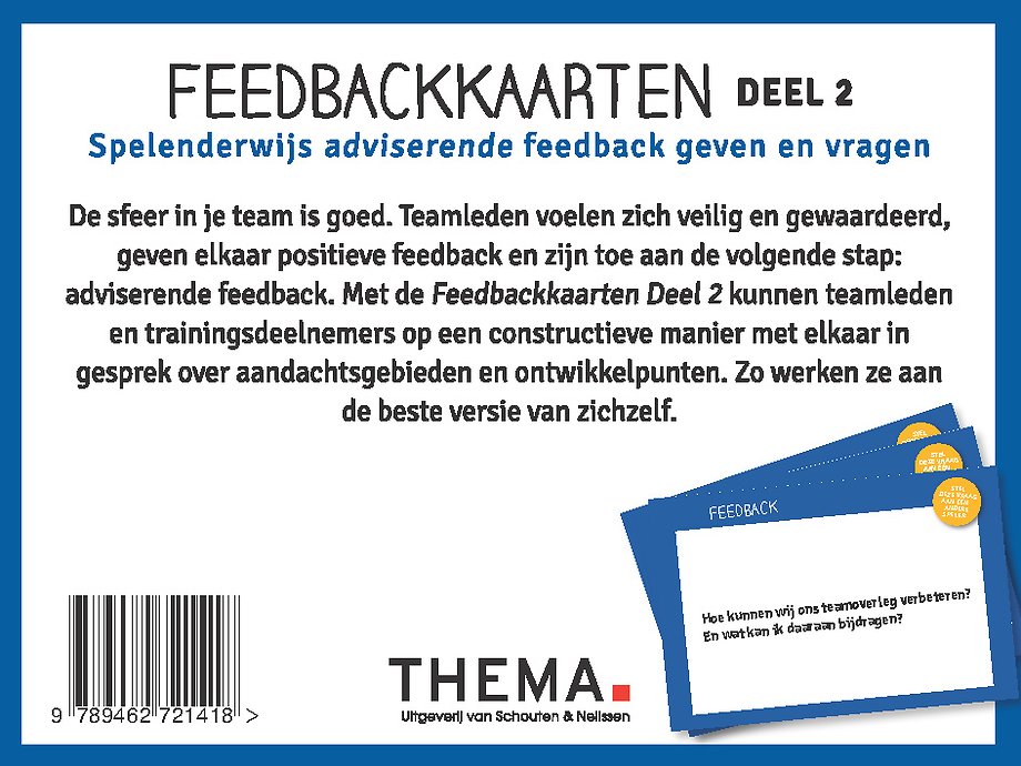 De focus van Feedbackkaarten deel 2 ligt op het vragen van adviserende feedback. Het is een op zichzelf staand spel en een vervolg op Feedbackkaarten deel 1, waarin positieve feedback centraal staat. Wie na deel 1 klaar is voor een volgende stap en wil weten waar zijn ontwikkelpunten liggen, heeft nu een praktisch instrument in handen.